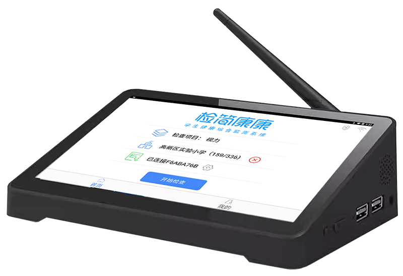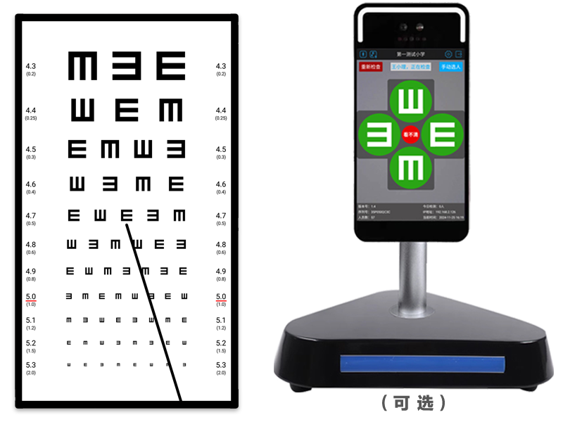 智能化视力表,无需人工指示视标,全过程自动化,并配有专用铝合金箱,方便携带;对接了主流电脑验光仪。另有自助检查终端、检查手持机,检查码热敏打印机、扫码盒等可选外设。