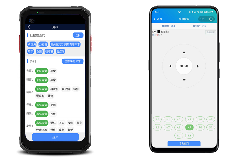对接了身高体重秤、血压计、肺活量仪、电脑验光仪等智能化设备,自动接收和提交数据。
